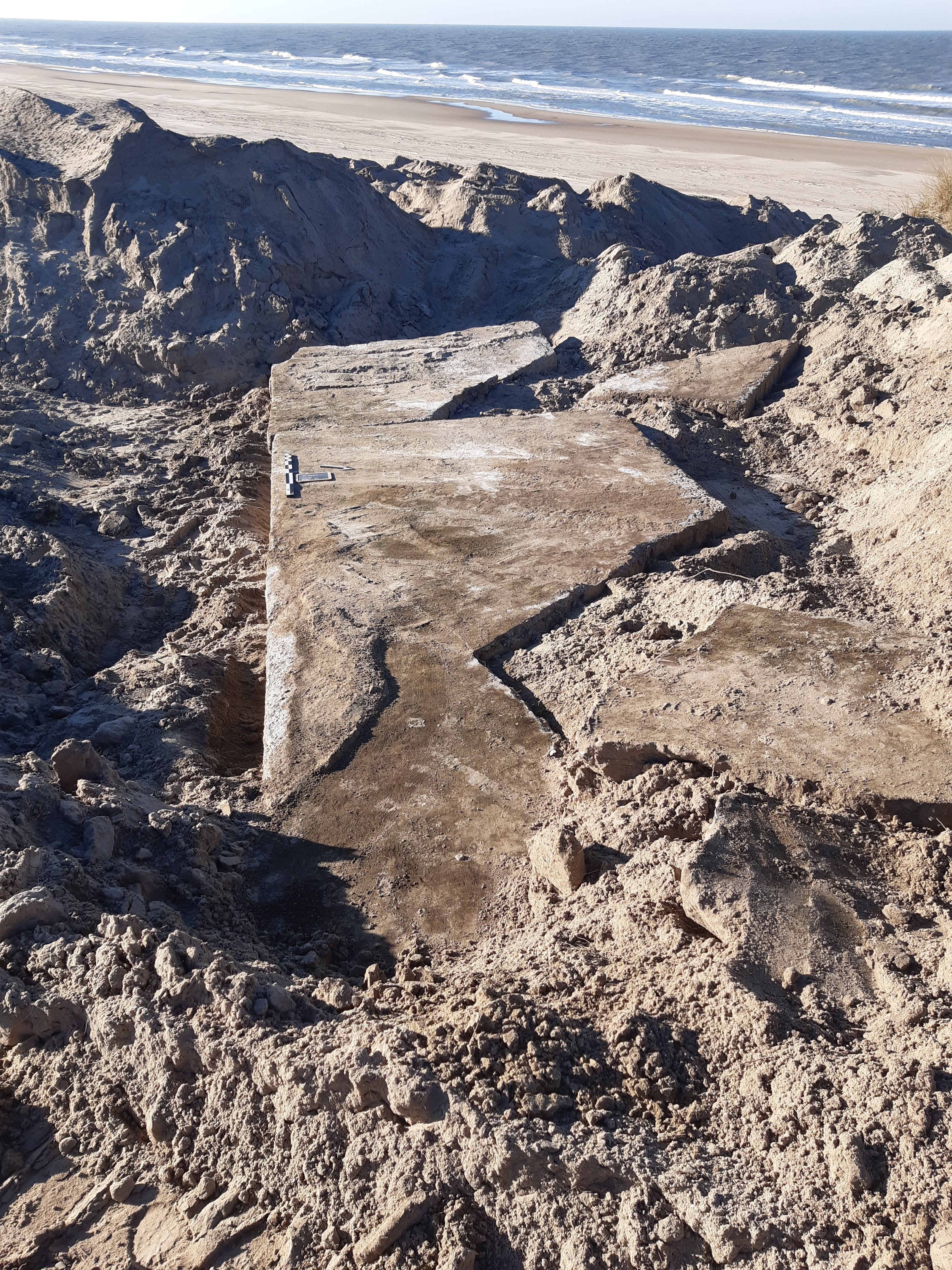 Een betonnen weg en fragmenten van een pad in baksteen, parallel met de kust. Beide maken deel uit van Stp. Condor, een Duitse radarpost uit WO2.