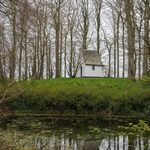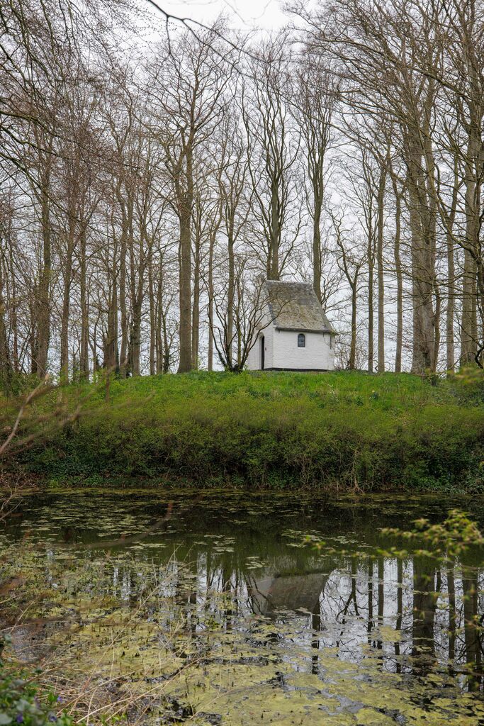 Zicht op motteheuvel en aanliggende gracht. Bovenaan vinden we een recente kapel.