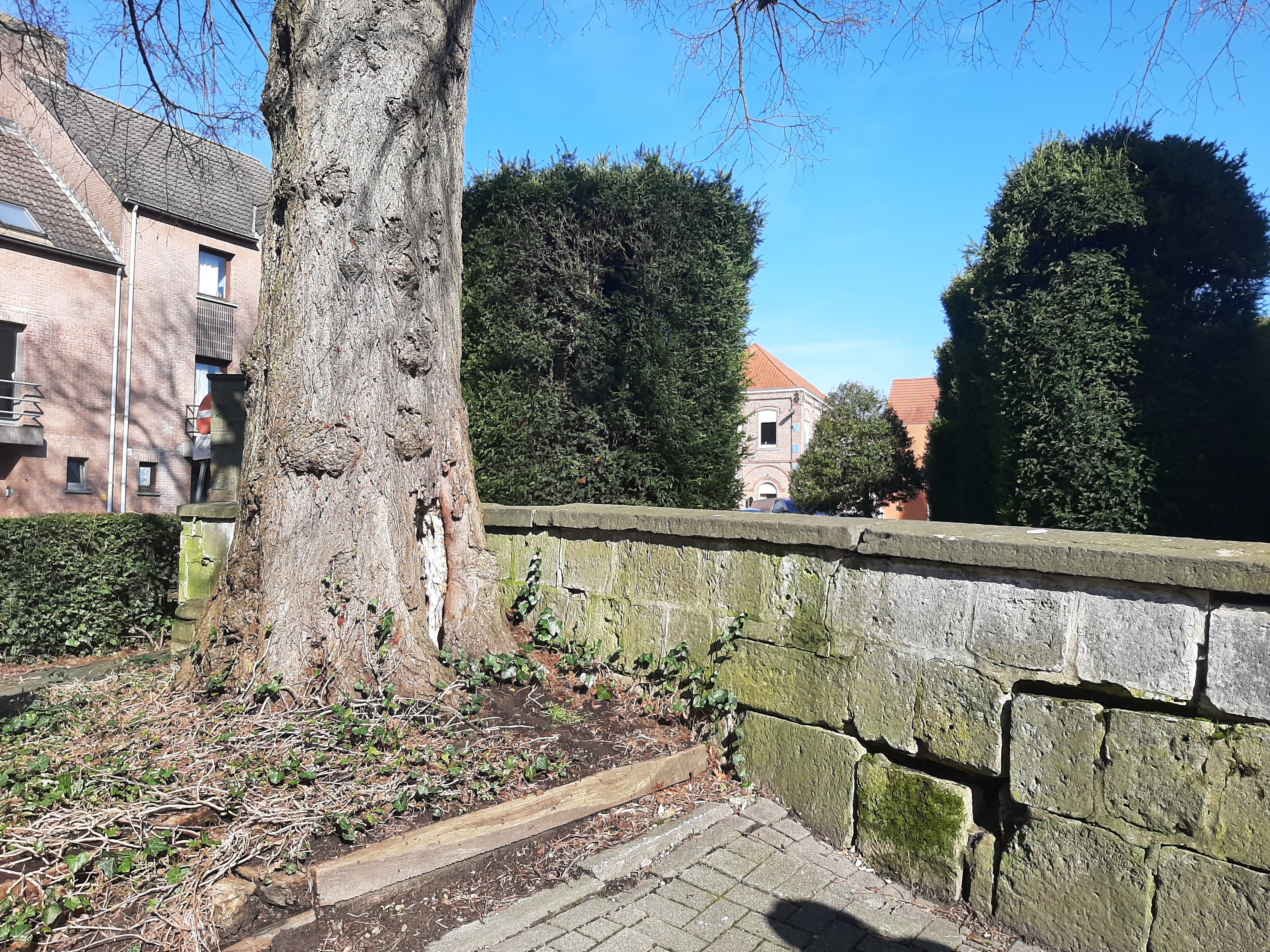 De afbeelding 'Vredesboom bij kerkhof' gemaakt door Peeters, Virginie wordt ter beschikking gesteld door Agentschap Onroerend Erfgoed (AOE) onder de volgende voorwaarden: Modellicentie voor gratis hergebruik, Naamsvermelding-GelijkDelen 4.0 Internationaal.