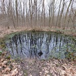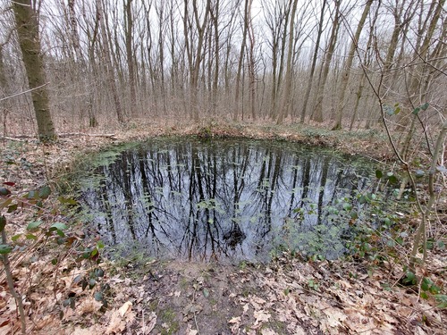 Bomkrater na de inslag van een V1 in Steentjesbos. Het is één van de talloze inslagen in de wijde omgeving van Antwerpen uit de laatste fase van de tweede wereldoorlog. Want ook al was het grootste deel van België in augustus-september 1944 bevrijd, Antwerpen bleef een doelwit voor de Duitse artillerie omwille van zijn strategische betekenis als aanvoerhaven. Natuurpunt herstelde de bomkrater recent (rond 2020?), als poel en leefplaats voor libellen en amfibieën.