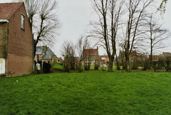 Omschrijving: ROHM - WEST-VLAANDEREN CEL M & L school 20ste eeuw ? tuin achter school zicht op pastorie