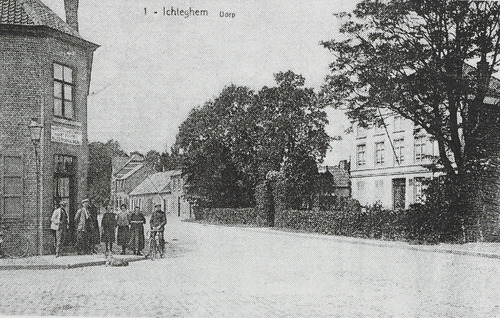 Omschrijving: ICHTEGEMSE HERINNERINGEN. Blz. 13 bis. Hoek van de Markt met herberg "In Breydel en De Coninc" en het huis van notaris Dekeyser omstreeks 1920.