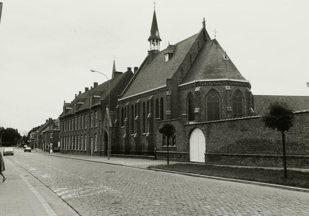 De afbeelding 'Klooster met school' wordt ter beschikking gesteld door Agentschap Onroerend Erfgoed (AOE) onder de volgende voorwaarden: Modellicentie voor gratis hergebruik, Naamsvermelding-GelijkDelen 4.0 Internationaal.