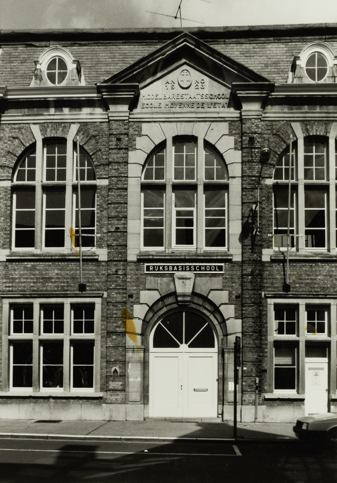 De afbeelding 'Middelbare Staatsschool, later Rijksbasisschool' wordt ter beschikking gesteld door Agentschap Onroerend Erfgoed (AOE) onder de volgende voorwaarden: Modellicentie voor gratis hergebruik, Naamsvermelding-GelijkDelen 4.0 Internationaal.