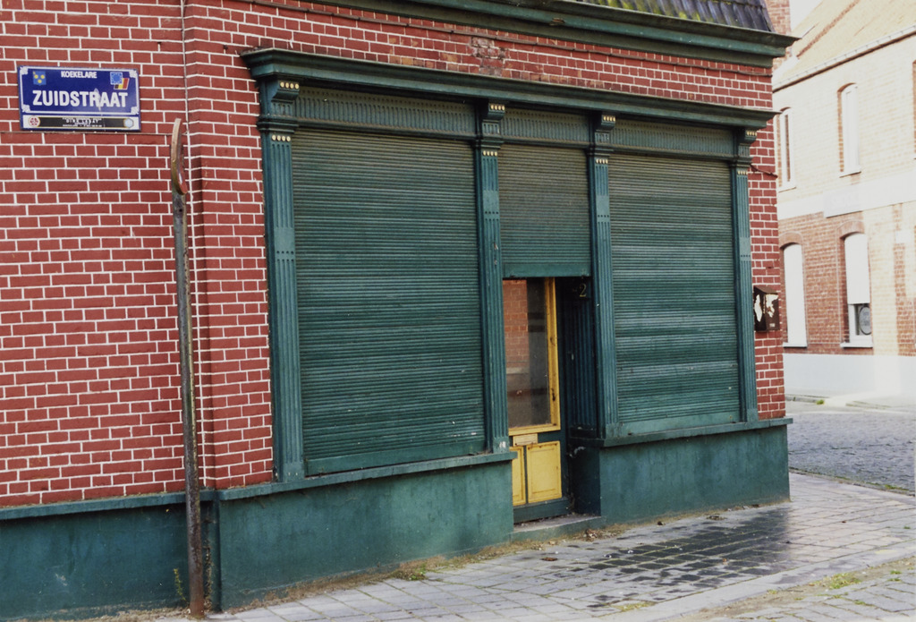 Omschrijving: ROHM West-Vlaanderen Cel Monumenten en Landschappen samenstel met 4 winkelpui Straatbeeld