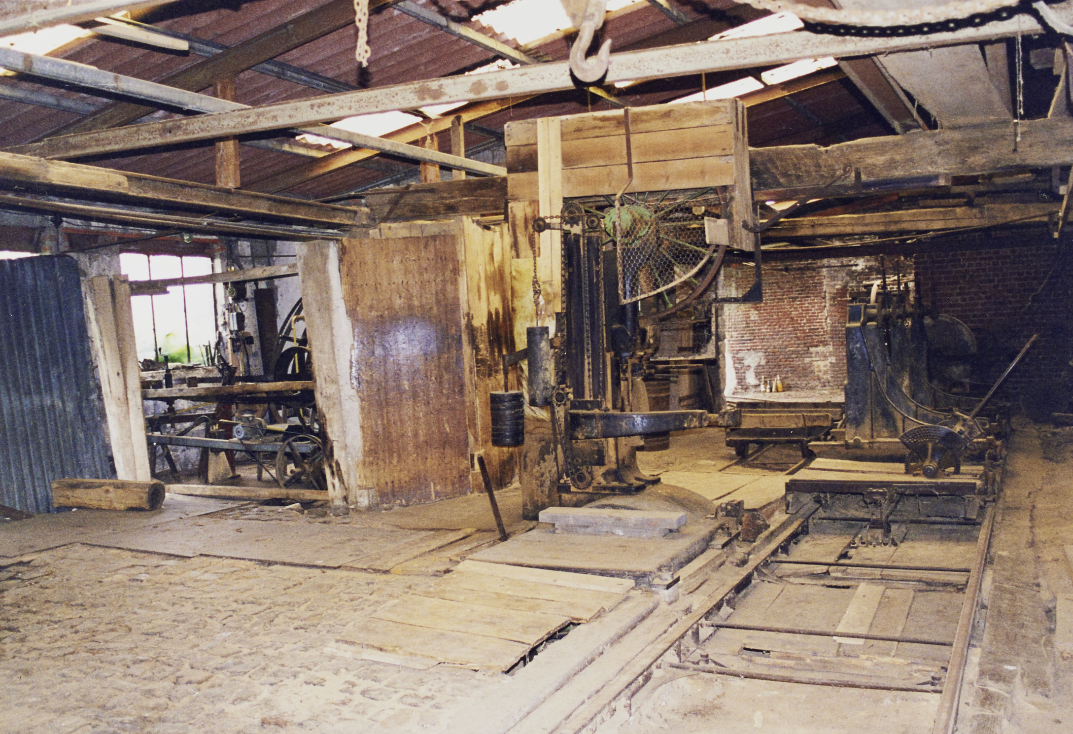 Omschrijving: Boomzagerij met spoor boomslede, boomzaag houten hokje met planeerlen voor rechter v/d