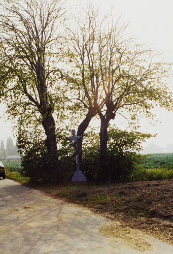 Omschrijving: ROHM-WEST-VLAANDEREN CEL M & L recent kruis bij drie gekandelaarde linden Veldstraat