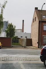 Omschrijving: ROHM West-Vlaanderen Cel Monumenten en Landschappen fabriek met oude schoorsteen XIX Straatbeeld Schouw
