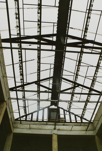 Omschrijving: ROHM West-Vlaanderen Cel Monumenten en Landschappen Ijzermagazijn Huib Hoste Werf restauratiewerken lichtval na demontage gekleurd gla
