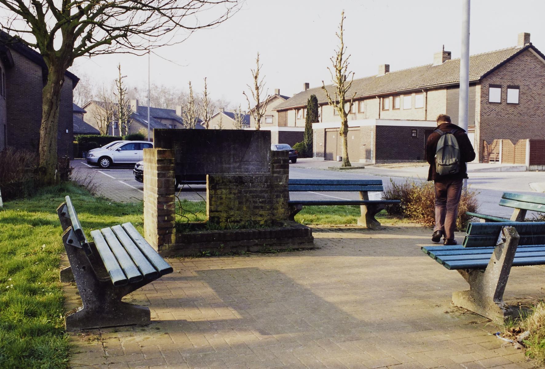 Omschrijving: ROHM West-Vlaanderen Cel Monumenten en Landschappen Hoek en Albrecht Rode Pleintje met zitbanken en naambord wijk