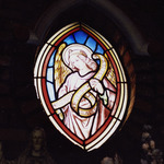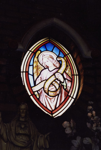 Omschrijving: R-O Vlaanderen onroerend erfgoed kapel interieur: glasraam keihoek