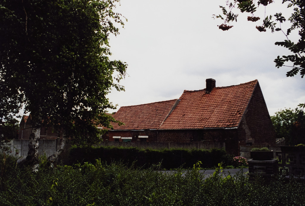 Omschrijving: R-O Vlaanderen onroerend erfgoed dubbelhuis met biigebouwen stalletjes in achterliggende wei