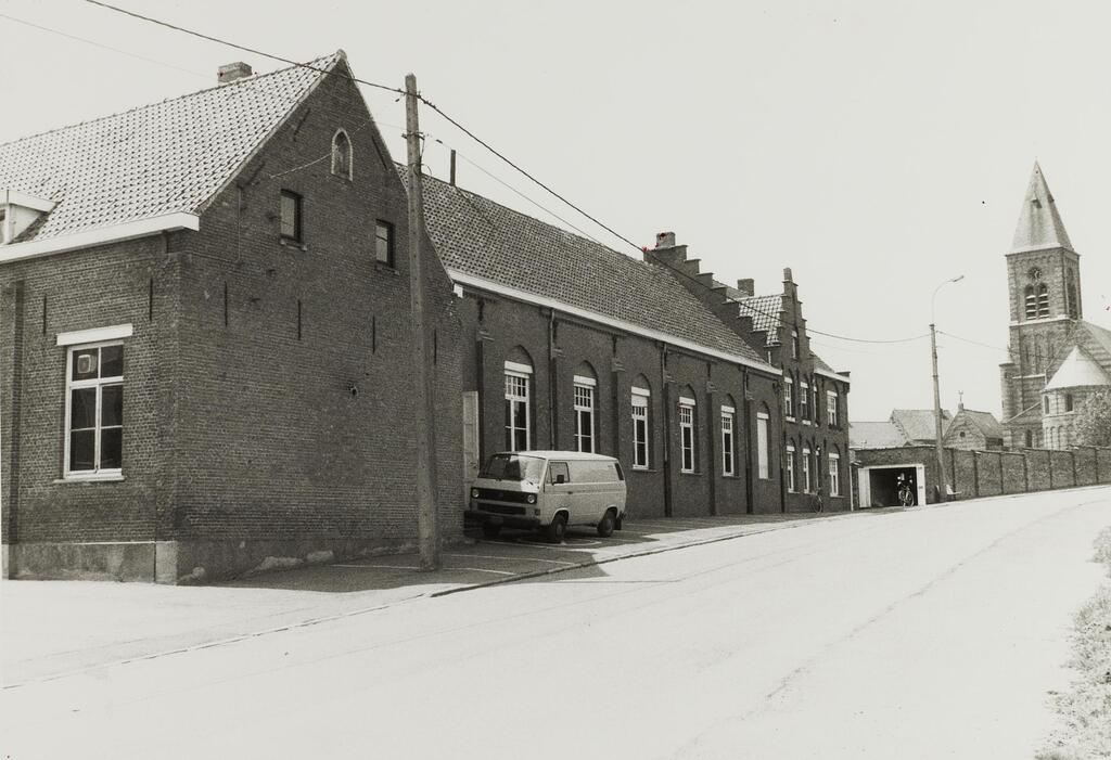 Omschrijving: D.V.G 10814 r.huis - vooren pastorie n.o.v. R. Cauwe (Pruppi) 1920 ?? fig 224 aangepast? spiegelbeeld uitgebouwd het school. pastorie met verande & overdekt terras (loggie) diephuis uitgevoerd?? DVG 10815 woonhuis eigenaar=pastoor! met aanpalende zaal voor voorlgege patronage kerk en school nove R. Cauwe 1920 (mogelijkes gebuikt als pastorie, zo deze uit werd wedhofgebouwd) Blande -> ingvoerd als plan, behalve oorspr. voorzien getroffen dakvensters boven klasvleugel & tav huis vleugel later toegevoegd