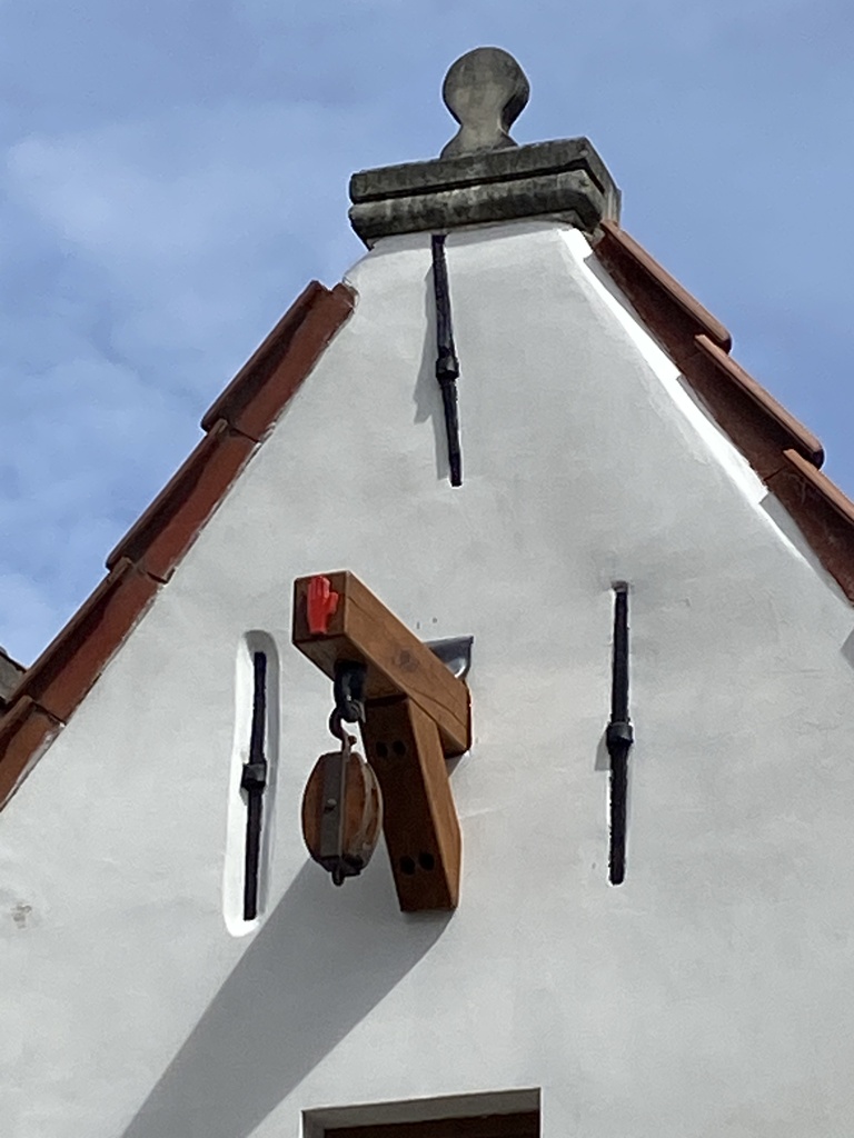 Traditioneel diephuis van drie traveeën en twee bouwlagen onder een zadeldak (nok loodrecht op de straat, pannen), uit de 17de eeuw.