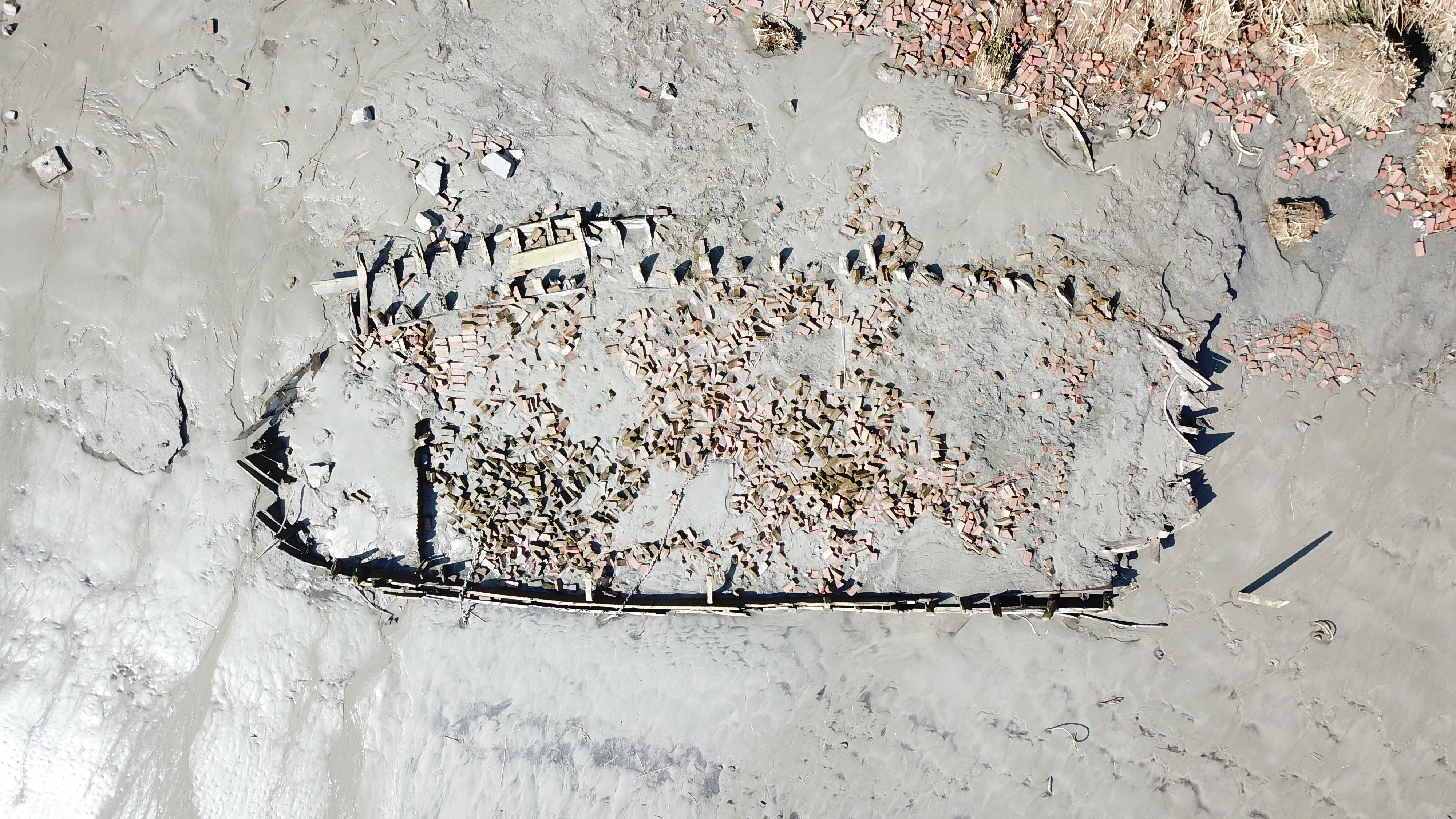Dronebeelden van het houten scheepswrak II met baksteencargo op de linker Scheldeoever in maart 2021.