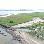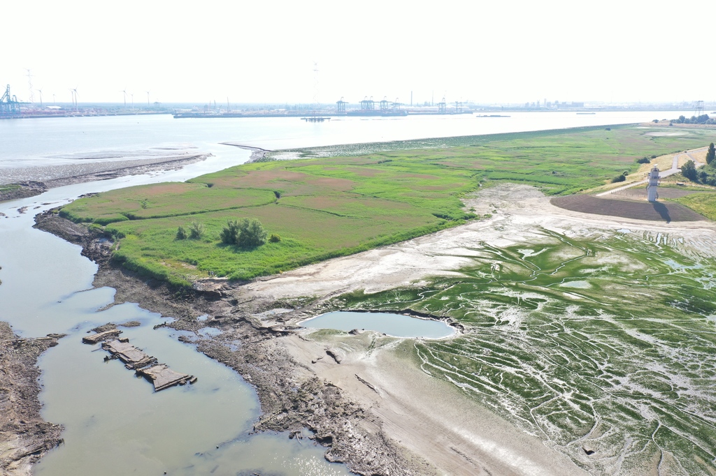 Dronebeelden en orthofoto van de vrijgespoelde 19de-eeuwse sluisvloer van een uitwateringssluis in een getijdengeul tussen de Schelde en het herwonnen natuurgebied van de Prosperpolder.