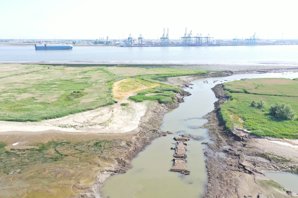 Dronebeelden en orthofoto van de vrijgespoelde 19de-eeuwse sluisvloer van een uitwateringssluis in een getijdengeul tussen de Schelde en het herwonnen natuurgebied van de Prosperpolder.