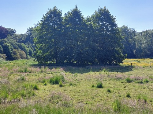 Klump met Tamme kastanje (Castanea sativa) in Scheldevallei. Bomen op de achtergrond behorende tot het kasteelpark van kasteel Ocket.