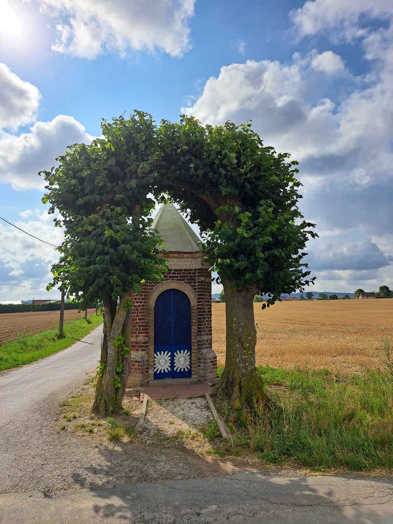 De afbeelding 'Wegkapel met twee lindes' gemaakt door Claeys, Dries wordt ter beschikking gesteld door Agentschap Onroerend Erfgoed (AOE) onder de volgende voorwaarden: Modellicentie voor gratis hergebruik, Naamsvermelding-GelijkDelen 4.0 Internationaal.