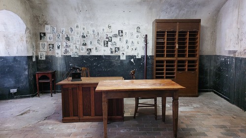 Binnenruimte in de traditorebatterij van het fort. Met tegen de muur (kopies van) schetsen van medegevangenen en kampbeulen van de hand van gevangene Jacques Ochs.