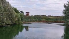 Vestinggracht en bewakingstoren van het fort van Breendonk, voormalige SS gevangenis. Foto gemaakt van op de Baileybrug uit 1944 in oostelijke richting