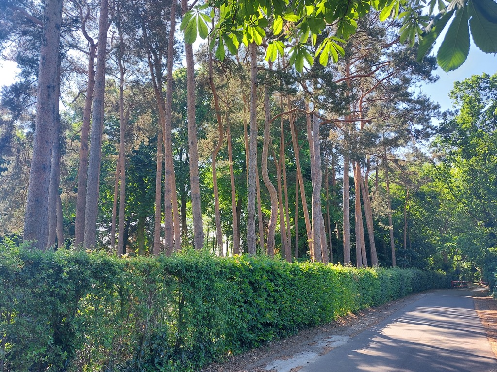 Naaldbomen op rivierduinen in private tuin./park