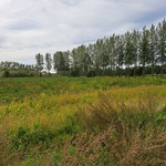 Landschapsbeeld vanaf de oude spoorweg met bomenrij bestaande uit populieren en zicht op oude hoeve