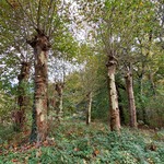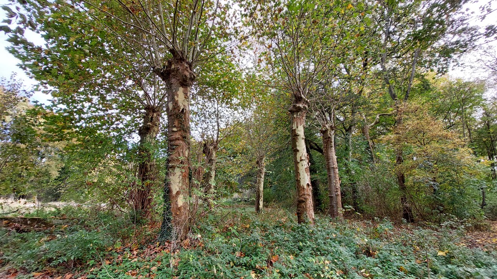 Groepje van zes geknotte platanen in het park bij het voormalige kasteel van Lembeek