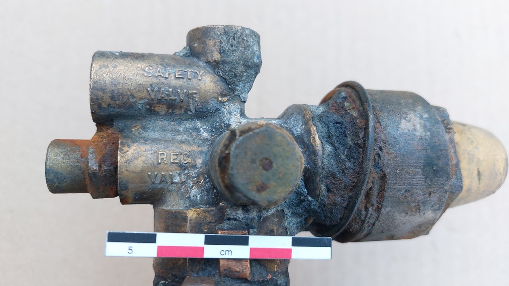 Details van de opschriften op een Britse luchtcilinder afkomstig uit een jachtvliegtuig van WO II.