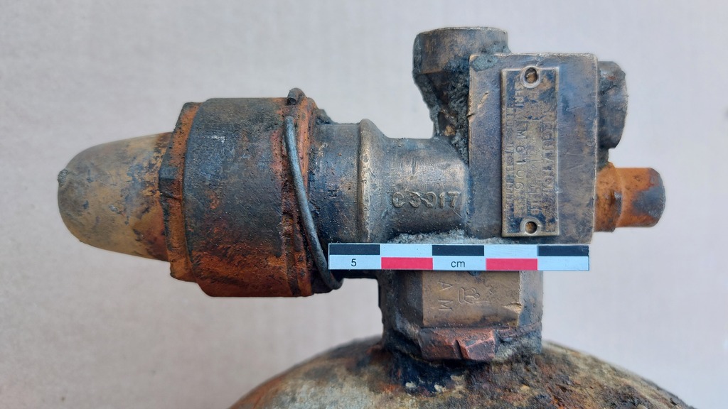 Details van de opschriften op een Britse luchtcilinder afkomstig uit een jachtvliegtuig van WO II.