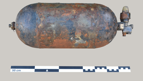 TV271096 WO II luchtcillinder Nieuwpoort-Strand-Kustweg (totaalbeeld) Voor- en keerzijde van een Britse luchtcilinder afkomstig uit een jachtvliegtuig van WO II, opgegraven bij strandmunitiewerken op het strand aan de oosteroever van Nieuwpoort.