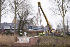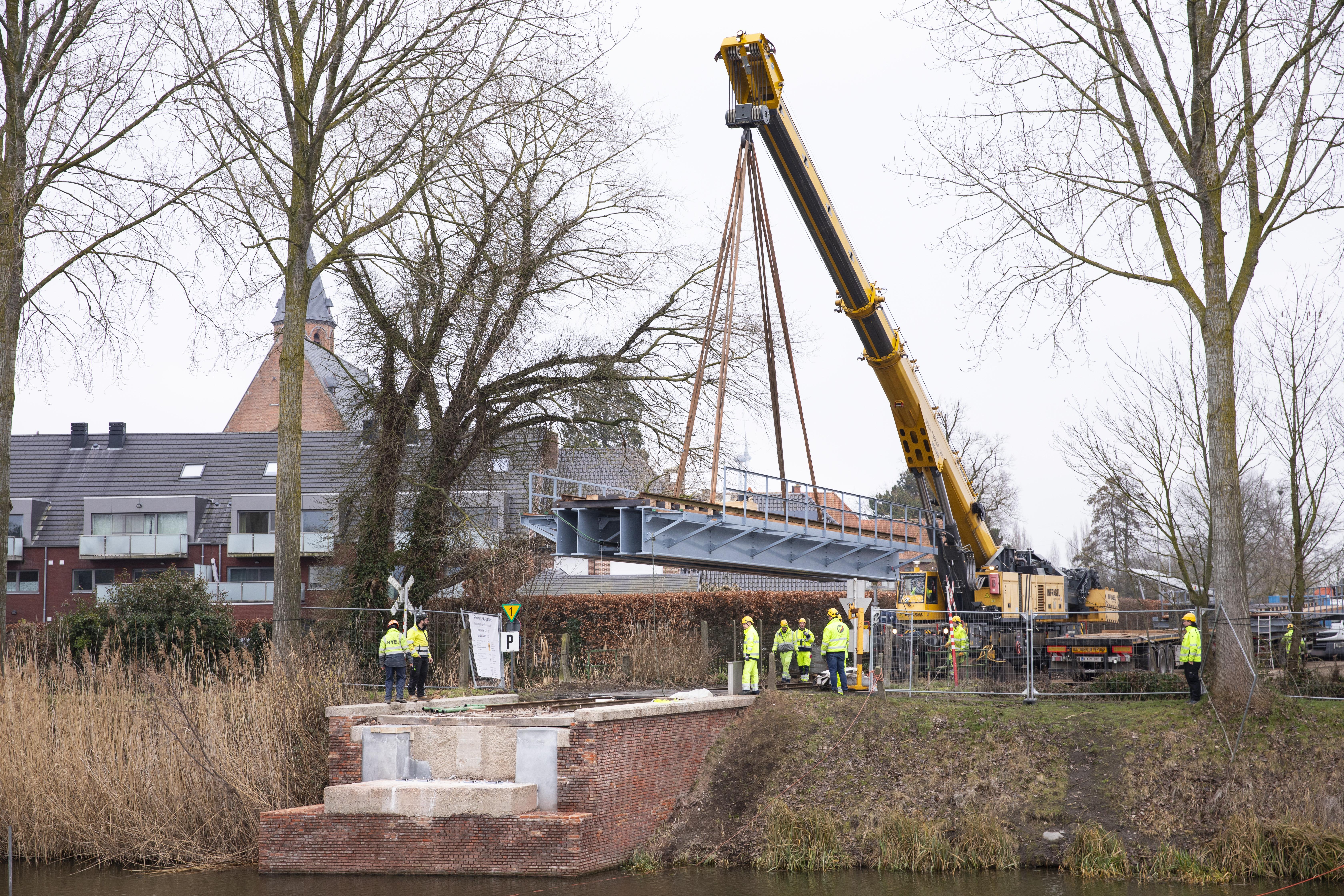 Plaatsing van het eerste deel van de gerestaureerde brug in februari 2026.