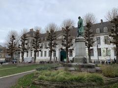 Centraal grasveld met standbeeld van André Dumont en omringend plantsoen