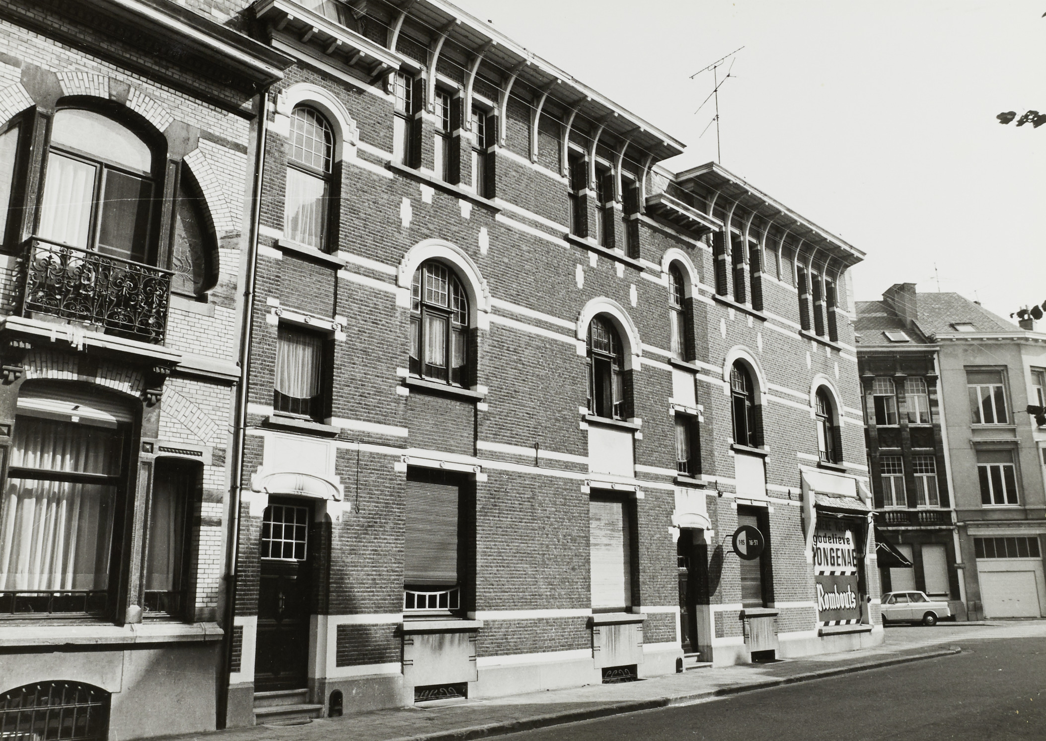 De afbeelding 'Hoekbebouwing met woningen en winkelhuis' wordt ter beschikking gesteld door Agentschap Onroerend Erfgoed (AOE) onder de volgende voorwaarden: Modellicentie voor gratis hergebruik, Naamsvermelding-GelijkDelen 4.0 Internationaal.