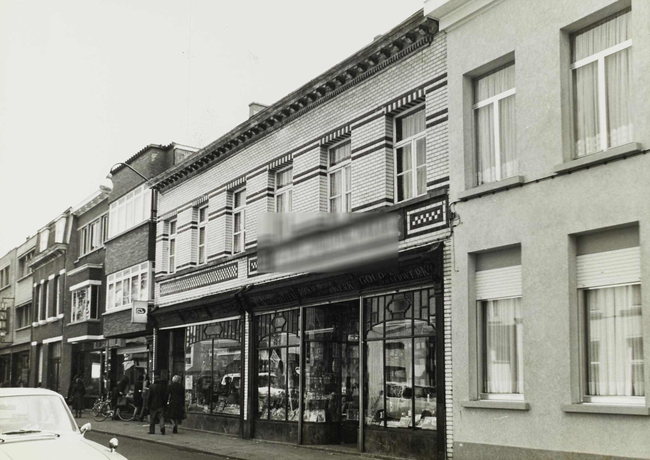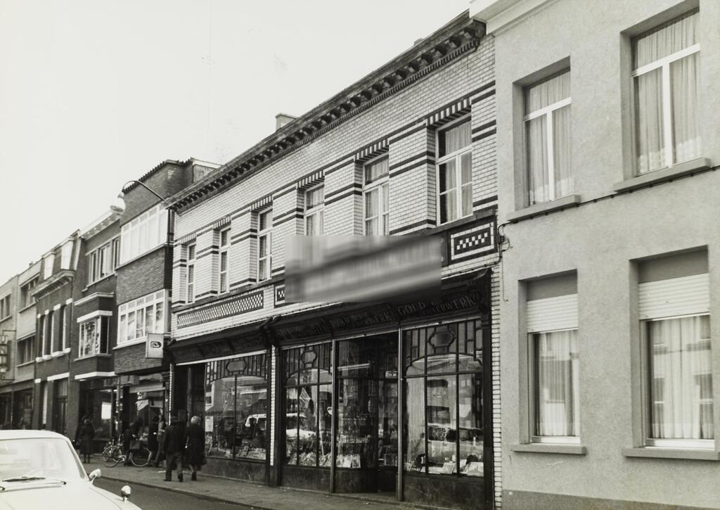 De afbeelding 'Twee winkelhuizen in eenheidsbebouwing' wordt ter beschikking gesteld door Agentschap Onroerend Erfgoed (AOE) onder de volgende voorwaarden: Modellicentie voor gratis hergebruik, Naamsvermelding-GelijkDelen 4.0 Internationaal.