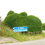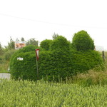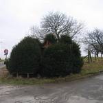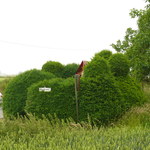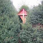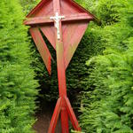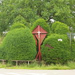 Sierhaag van taxus bij houten kruisbeeld