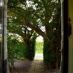 Uitgegroeide taxussen bij de ingang van de kapel.