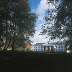 De naar de vijvers toegkeerde voorgevel van het neoclassicistische Kasteel Ter Rijst te Pepingen