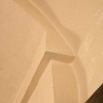 De Notelaer: Het twintigste-eeuwse structuurpleister dat de meeste bouwonderdelen van de beneden- en tussenverdieping overdekt en het onderzoek bemoeilijkte.