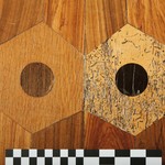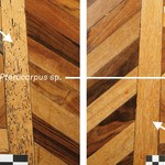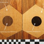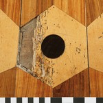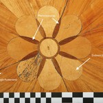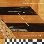 De Notelaer: Detail van de parketvloer ; met aanduiding van de verschillende houtsoorten.