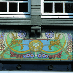 Woning met erker en tegeltableaus ; het transport op tegelpanelen (trein ; boot)